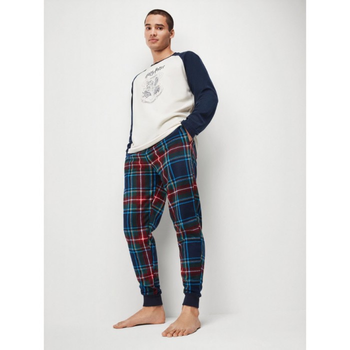 Σε αγαπημένο Harry Potter σχέδιο και καρώ παντελόνι με λάστιχο στο ύψος του αστράγαλου.
