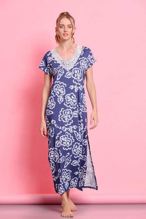 Βαμβακερό με μοναδιkό σχέδιο, λεπτομέρεια από δαντέλα στο στήθος και ψηλό σκίσιμο στο ένα πόδι.