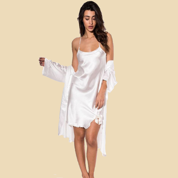 Πληροφορίες προϊόντος: Νυφικό σετ που αποτελείται από σατέν ρόμπα και σατέν κοντό νυχτικό.