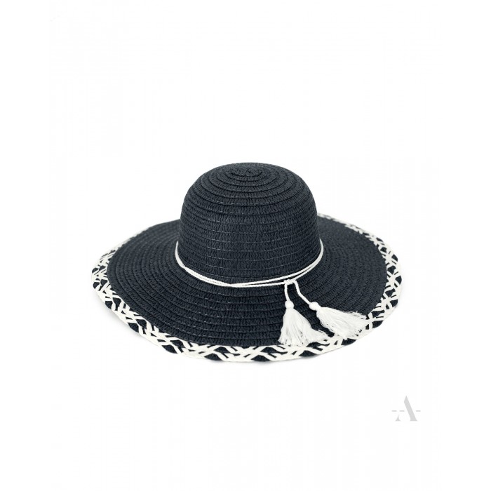 Υπέροχο ψάθινο μαύρο φαρδύ καπέλο με υπέροχες λευκές λεπτομέρειες και κρόσια στο δέσιμο.